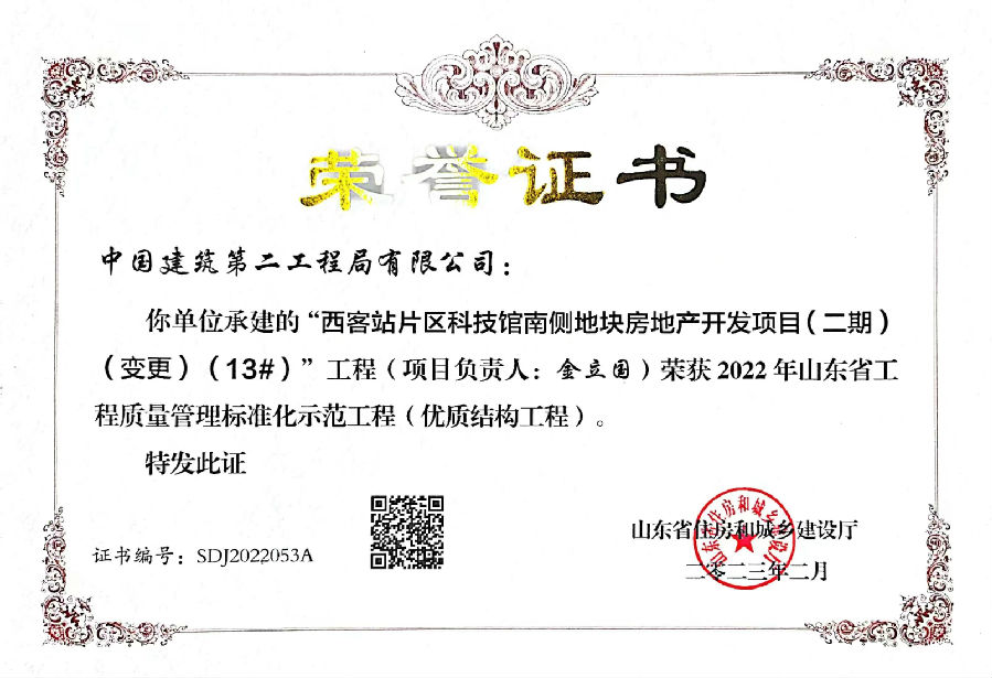近日,公司山東分公司濟南保利中科創新廣場項目13#樓,榮獲2022年山東省優質結構工程。