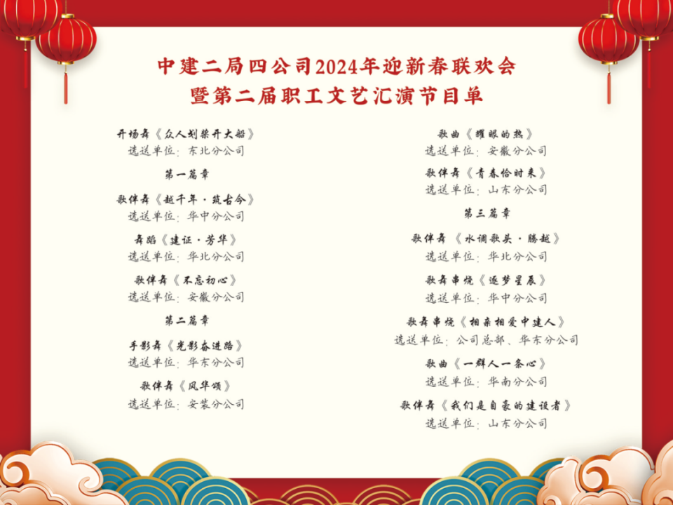 娓娓歌聲繞,綿綿琴音悠。熱情洋溢的《眾人劃槳開大船》正式揭開新春聯歡會的序幕。《越千年·筑古今》《建證·芳華》《不忘初心》《光影奮進路》《風華頌》等一系列精彩紛呈的節目展現了公司職工勇擔使命、腳踏實地的精神風貌,勾勒出四公司人對美好明天的憧憬與向往。
